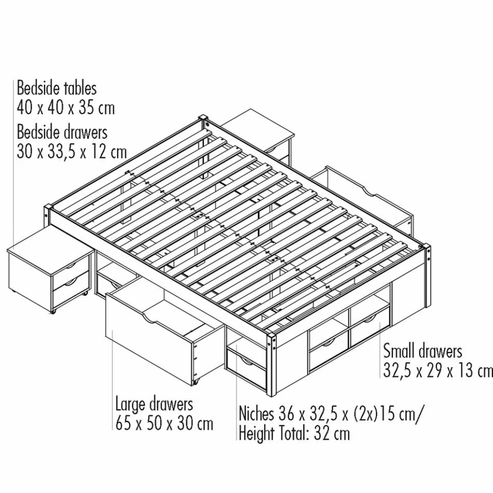 | Equipement lits: | Tiroirs, incl. chevet(s), incl. sommier à lattes , sans tête de lit |