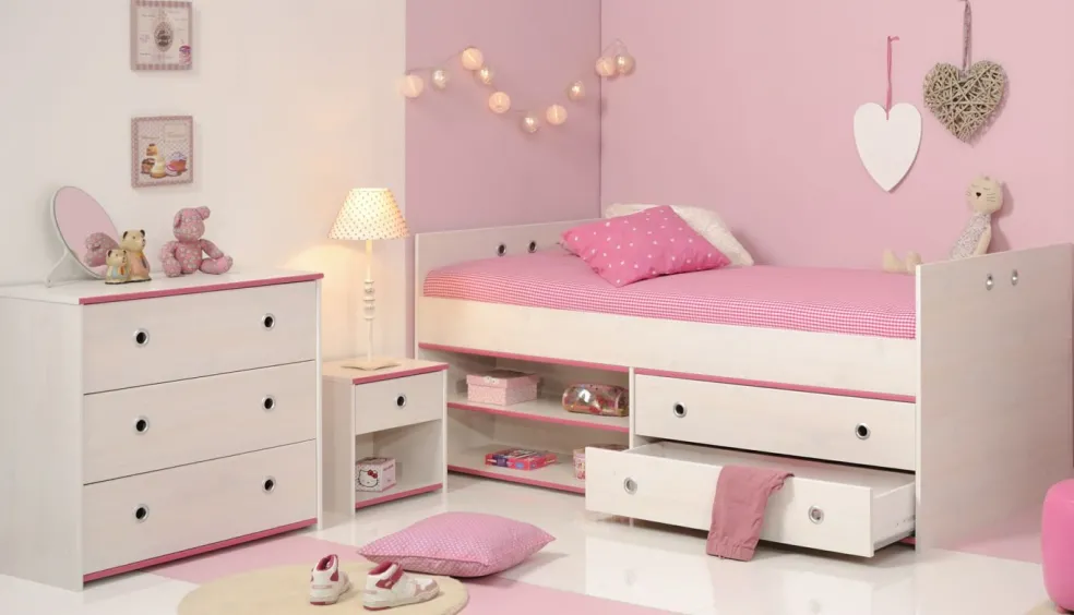 Cette chambre d’enfant 3 éléments est proposée dans un coloris clair et créera une ambiance conviviale pour se sentir bien. Les chants ton rose lui confèrent un aspect tendance. Le lit confortable avec ses grands tiroirs offre beaucoup de place pour les jouets, les livres et bien plus encore. Un chevet à côté du lit avec un tiroir très pratique permet de faire régner l’ordre. Une commode avec trois tiroirs offre un espace de rangement supplémentaire.