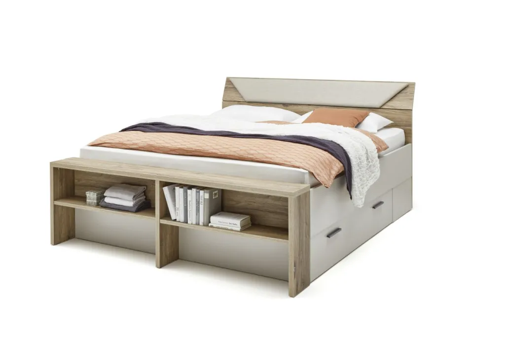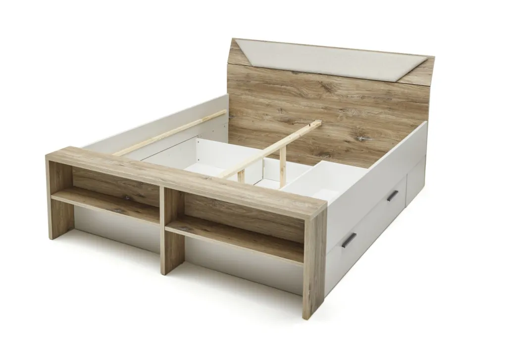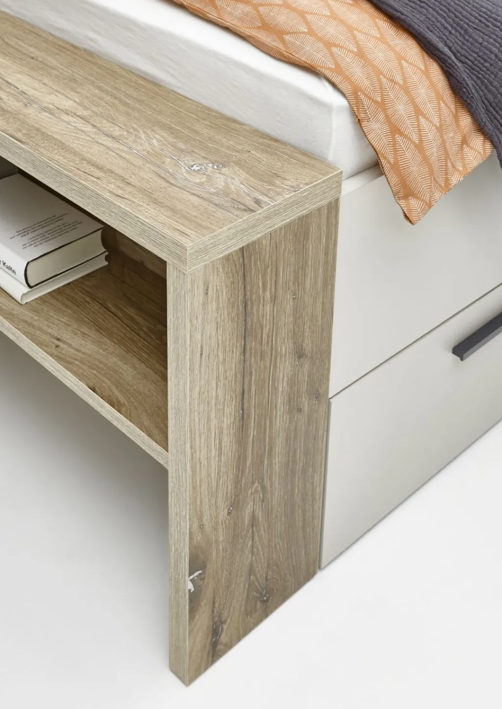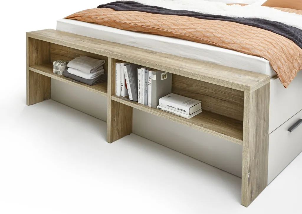 Inclus : 2 tiroirs et 1 étagère au pied du lit