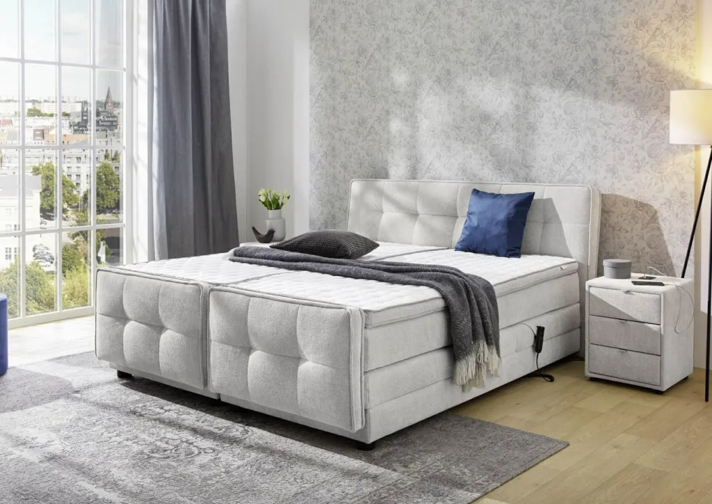 Le point fort de ce lit boxspring est indéniablement le réglage électrique. La télécommande ultra pratique permet de choisir facilement la position de couchage favorite grâce à une multitude de réglages de la tête et du pied de lit. La tête et le pied de lit décoratifs sont joliment réhaussés d’un passepoil double. Outre son joli design, le pied de lit offre l’avantage d’empêcher le matelas et le surmatelas de glisser lors du réglage (électrique) du lit.