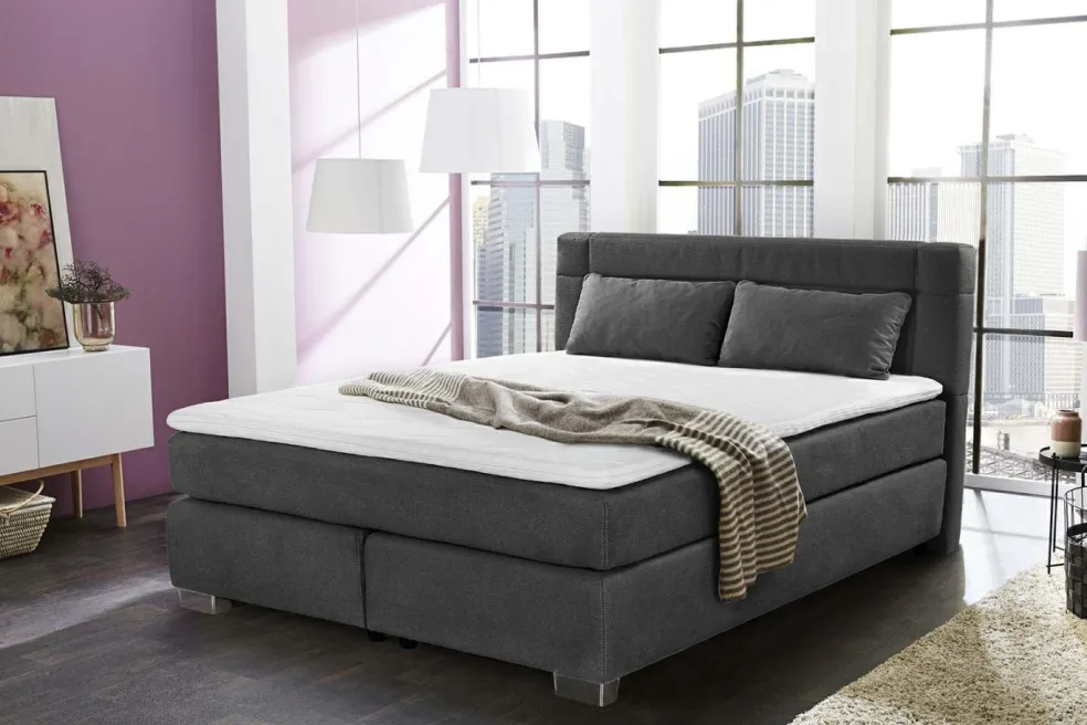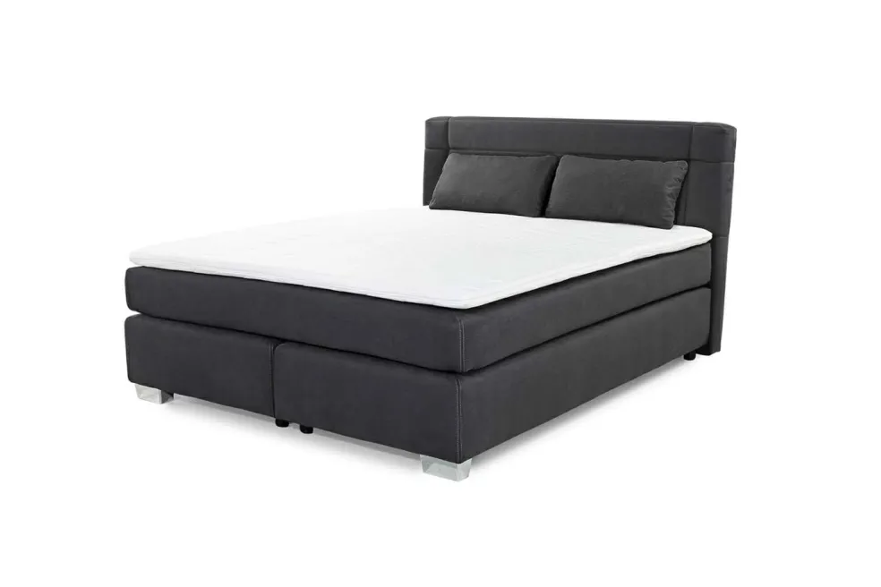 La base de ce lit boxspring tendance est un caisson avec garnissage à ressorts bonnell utilisé comme suspension. Sur ce caisson se trouve, un matelas 7 zones à ressorts ensachés tonneaux dans un revêtement tandem (c.à.d. deux âmes de matelas dans une housse empêchant chaque matelas de glisser) La double suspension ainsi formée crée un confort unique avec une adaptation optimale à la morphologie et réduction de la pression. Le surmatelas en mousse haute résilience vient parfaire cette expérience de couchage unique. Le système boxspring garantit un confort de sommeil extraordinaire grâce à son excellent système individuel de suspension double.