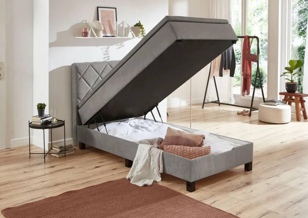 Avec coffre de lit intégré, couvercle facile à ouvrir grâce au vérin à gaz
