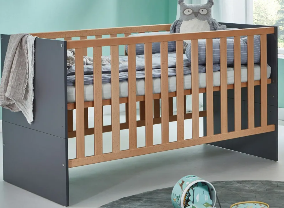 1 lit de bébé avec sommier à lattes réglable sur 4 niveaux ; tête de lit et pied de lit en deux parties ; grilles latérales avec barreaux plats dont une avec 3 barreaux amovibles
