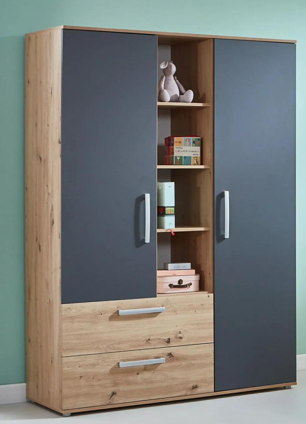 1 armoire à vêtements avec 3 portes, 2 tiroirs, 4 casiers ouverts, 4 tablettes amovibles et 1 barre de penderie