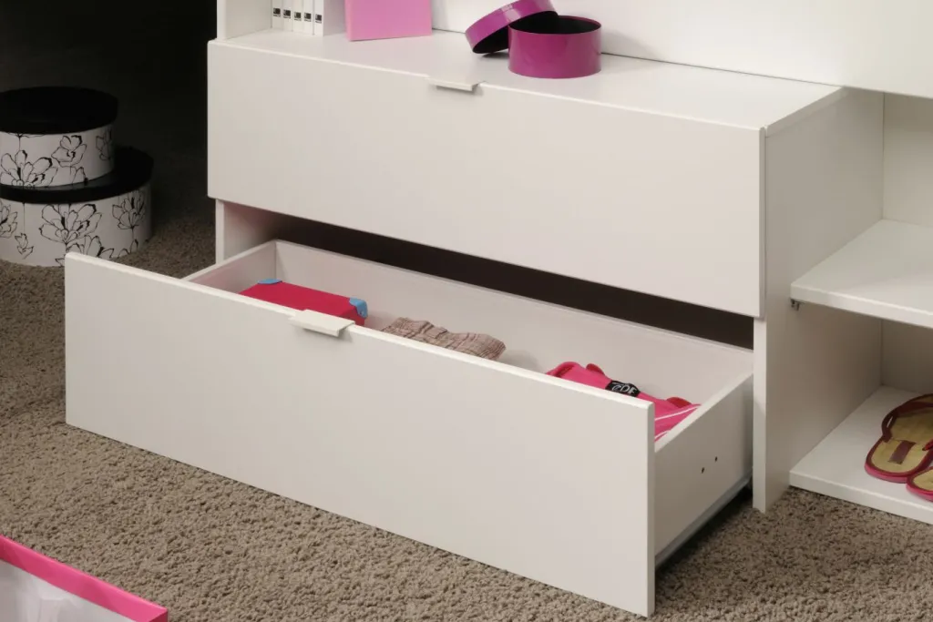 au centre : commode intégrée avec 2 grands tiroirs sur rails métalliques