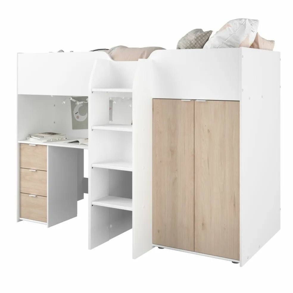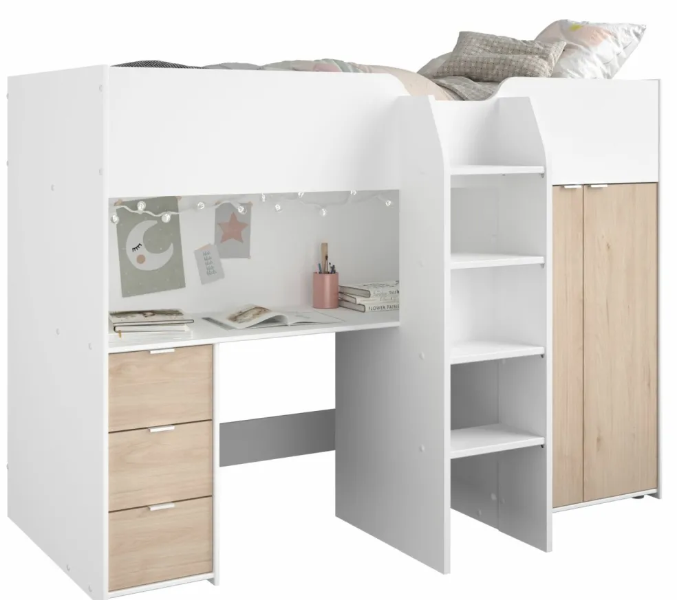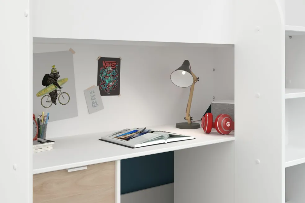 1 bureau intégré (à gauche sous la surface de couchage) avec 1 grand plateau, passe-câbles et 3 tiroirs