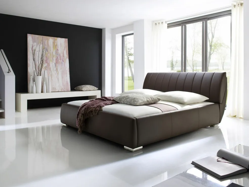 Lit rembourré ton marron avec revêtement en cuir synthétique : face avant 100% polyuréthane, dos : 50% coton, 50% polyester