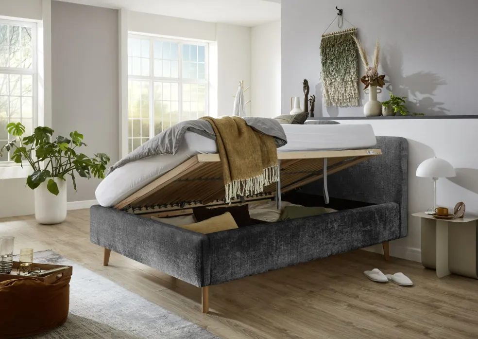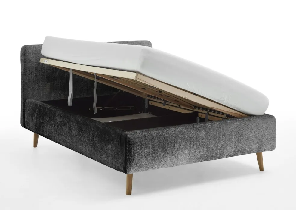inclus : un coffre de lit avec aération et sommier à lattes en bois multiplis avec ouverture latérale