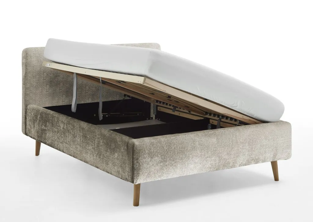 inclus : un coffre de lit avec aération et sommier à lattes en bois multiplis avec ouverture latérale