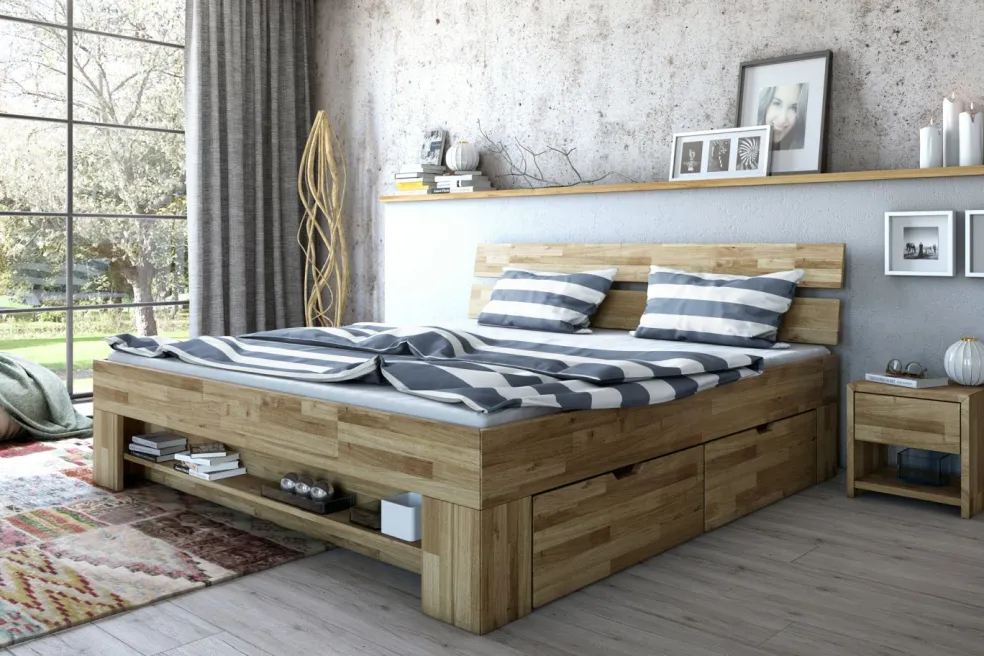Inclus : 4 tiroirs de lit et une étagère au pied du lit