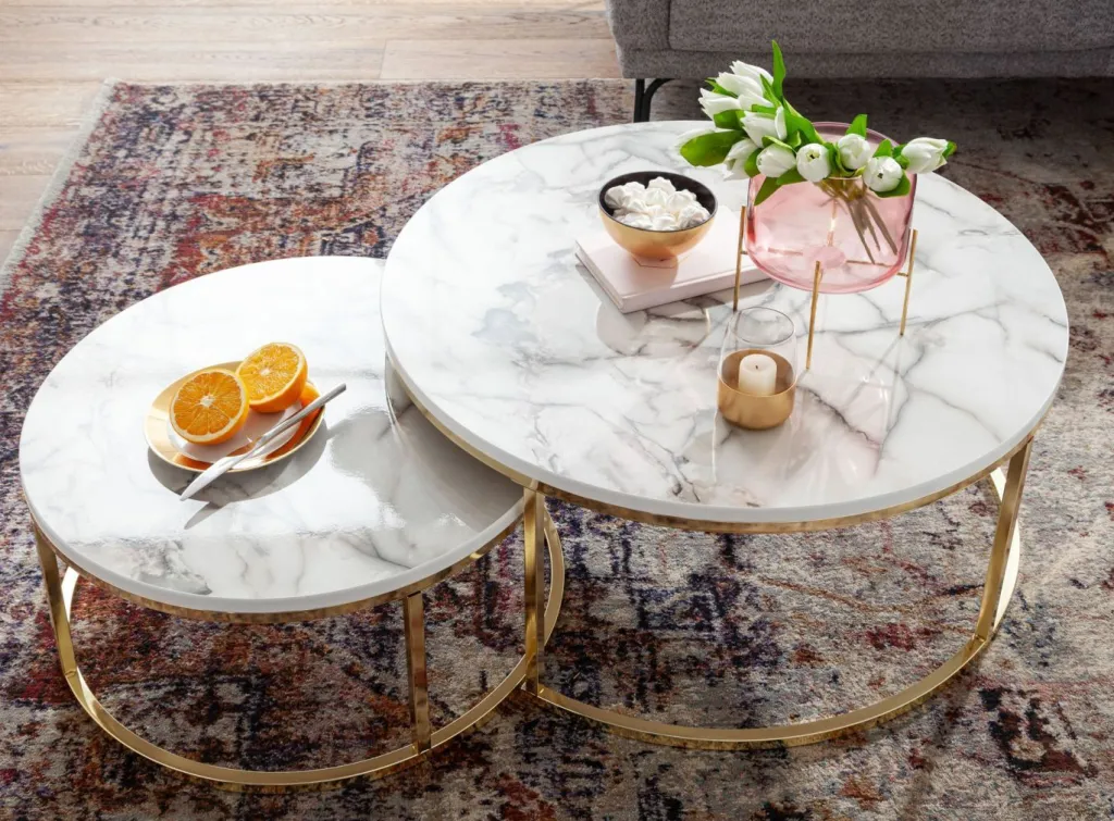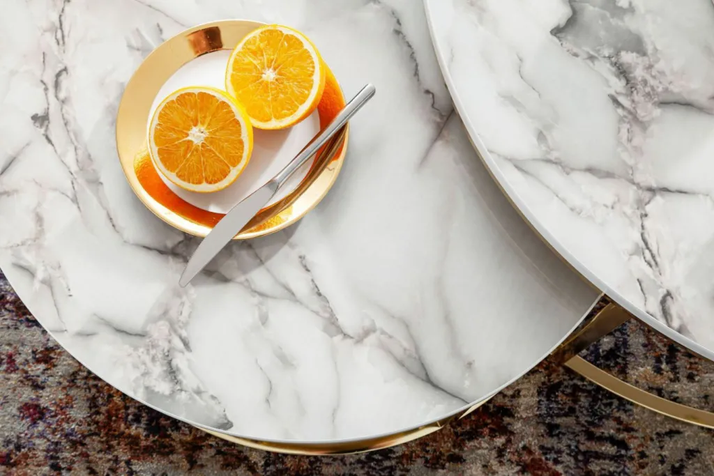 Plateaux : MDF (panneaux de fibres de bois de densité moyenne) pelliculé aspect marbre blanc ultra brillant