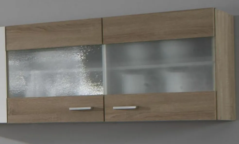 Issu de la jolie cuisine SONEA, voici : un meuble haut vitré dans les jolis tons : blanc/ imitation chêne Sonoma. Il dispose de deux tablettes amovibles.