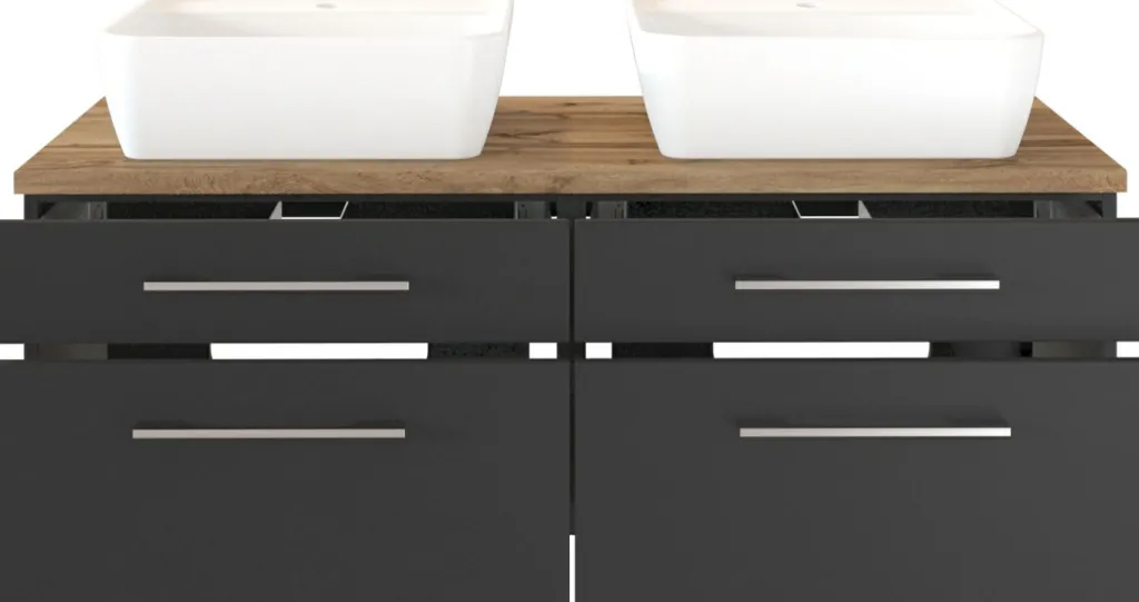 1 meuble sous vasque avec 2 tiroirs bas et 2 tiroirs hauts avec fermeture amortie, incl. découpe siphon
