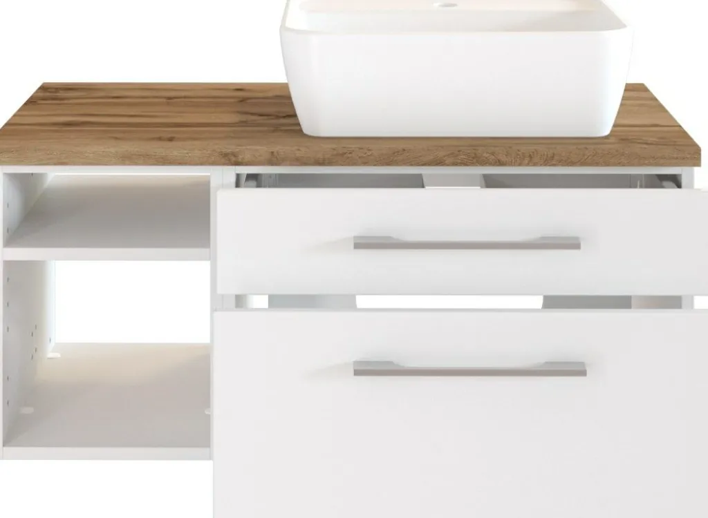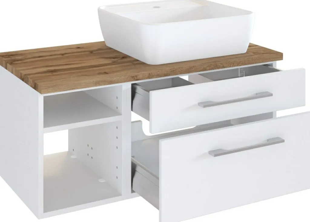 1 meuble sous vasque avec 1 tiroir bas et 1 tiroir haut avec fermeture amortie et 2 casiers ouverts, incl. découpe siphon