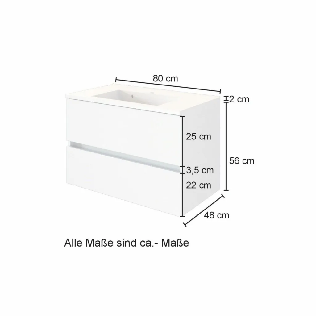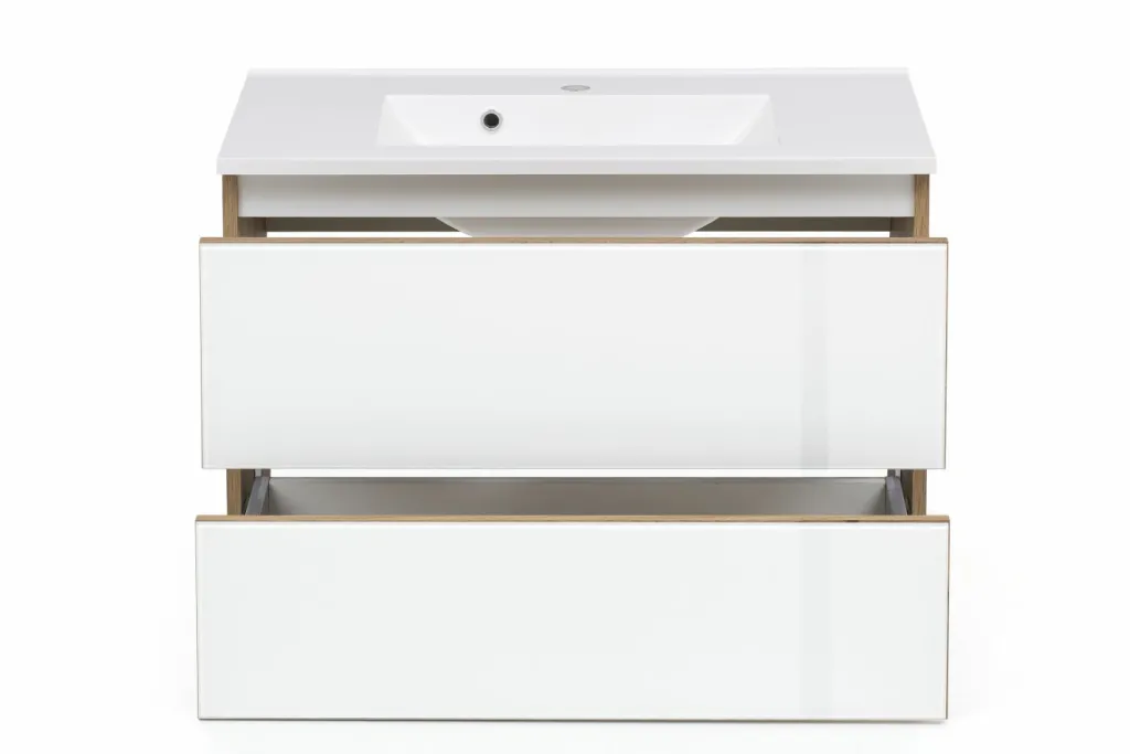 1 meuble sous vasque avec 2 tiroirs à fermeture amortie (à sortie totale), sans poignées
