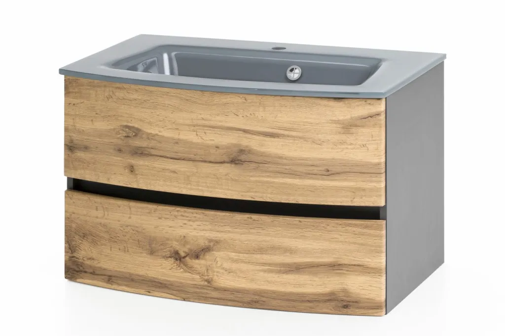 1 meuble sous vasque avec 2 tiroirs en métal à sortie totale avec fermeture amortie, façades arrondies