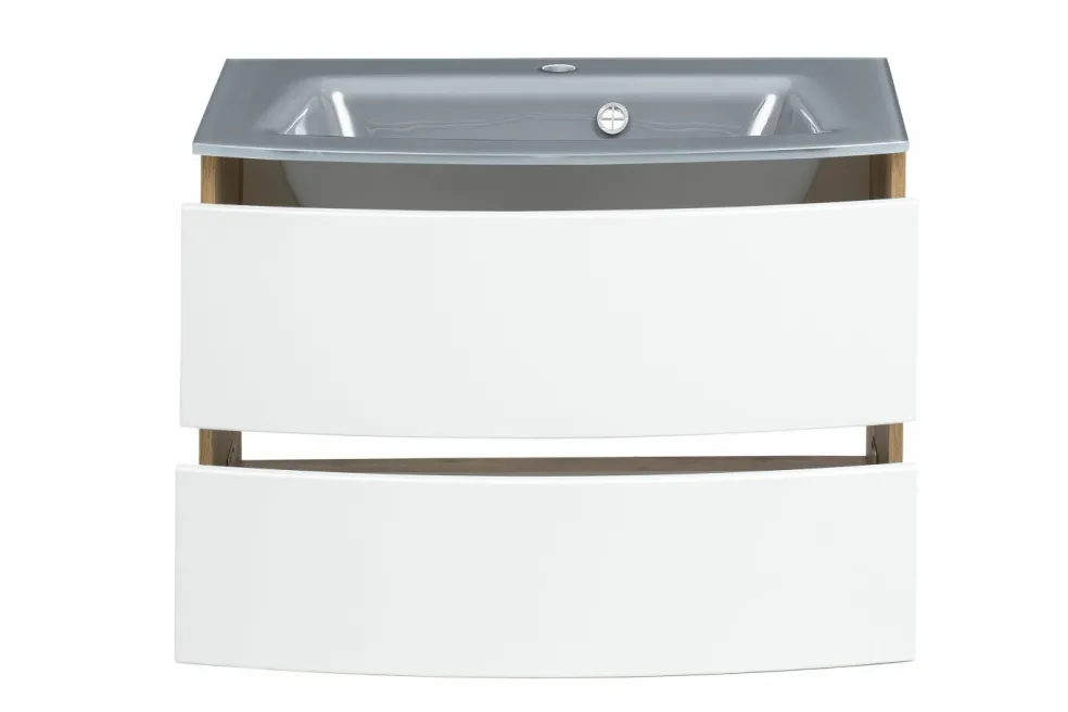 1 meuble sous vasque avec 2 tiroirs en métal à sortie totale avec fermeture amortie, façades arrondies