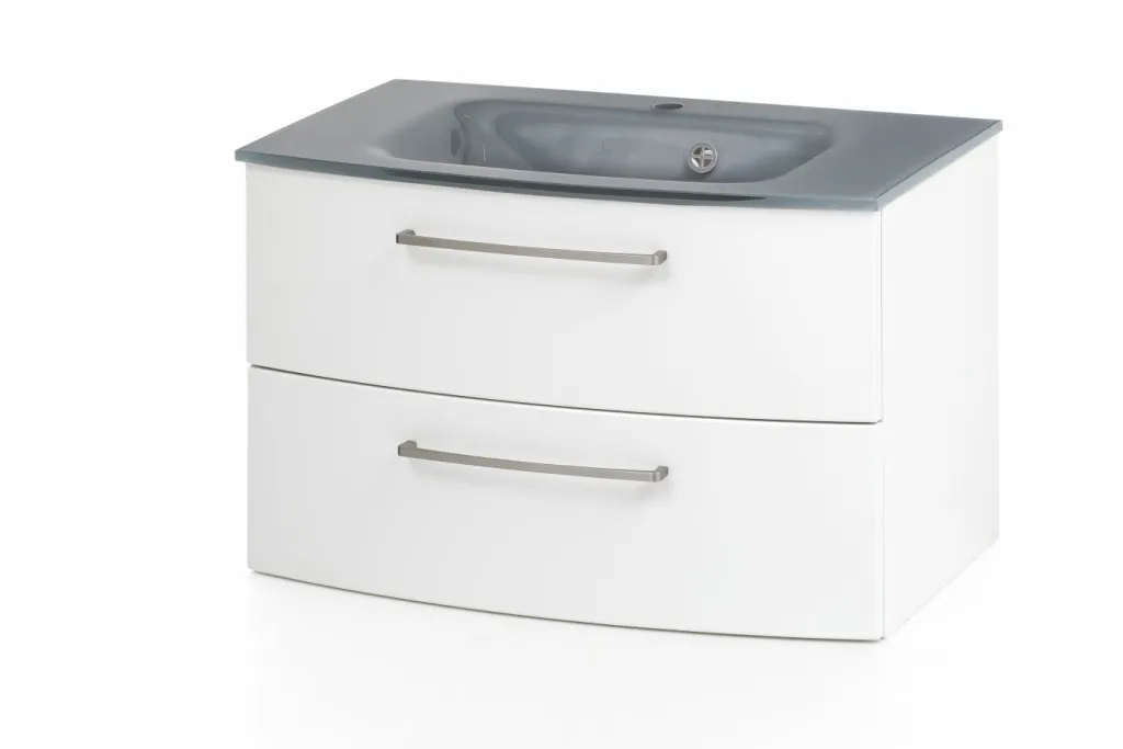 1 meuble sous vasque avec 2 tiroirs à fermeture amortie (à sortie totale), tiroir inférieur avec barres latérales, avec façades arrondies
