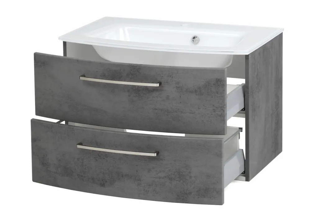 1 meuble sous vasque avec 2 tiroirs à fermeture amortie (à sortie totale), tiroir inférieur avec barres latérales, avec façades arrondies