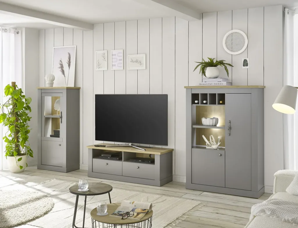 1 banc TV avec 2 casiers pour l’équipement, 2 passe-câbles et 2 tiroirs