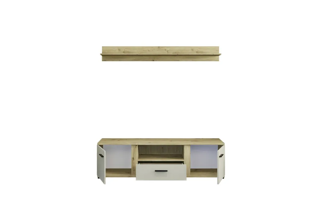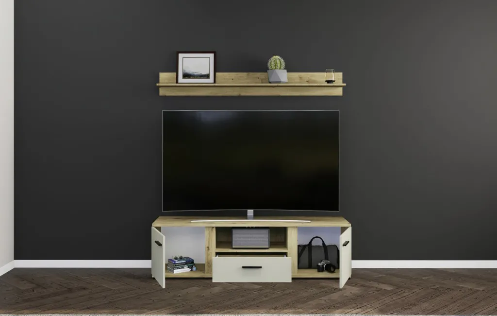 1 banc TV avec 2 portes, 1 tiroir avec coulisses inférieures, 1 casier ouvert et 1 passe-câble