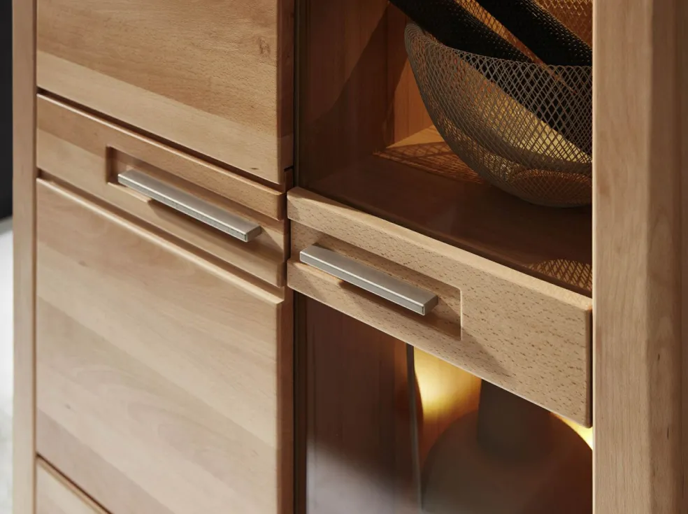 1 meuble vitrine avec 1 porte en bois, 1 porte en verre/bois et, derrière elles, 8 tablettes amovibles
