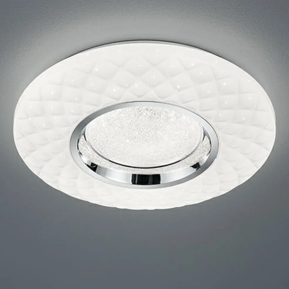 Le plafonnier MAGNOLIA garantit un design lumineux dans sa forme la plus parfaite. La lampe LED ronde sait se transformer pour s’adapter à tous vos souhaits en matière d’éclairage. Grâce à son design moderne, le luminaire attirera rapidement tous les regards dans votre intérieur. Le plafonnier blanc a un diamètre de 39 cm. La forme ronde apporte la touche finale au style harmonieux du plafonnier. La lampe dispose d’un variateur SWITCH intégré. Ce variateur permet de régler l’intensité lumineuse sur 3 niveaux à l’aide de la télécommande fournie pour augmenter la sensation de bien-être dans vos pièces. Ainsi, le plafonnier peut être utilisé de multiples façons. L’abat-jour annulaire de la lampe imite un ciel étoilé qui conférera à la pièce un charme irrépressible. De même, la lampe dispose d’une fonction veilleuse. Les jolies couleurs (blanc/chrome) soulignent le design élégant qui s’intègre facilement dans les intérieurs classiques, de préférence, mais qui crée également un contraste stylé bienvenu dans les intérieurs modernes. La lampe dispose, en outre, de la technologie LED qui se caractérise par une luminosité de qualité et une excellente efficacité énergétique. Ceci permet d’économiser 80 % des coûts énergétiques par rapport aux ampoules halogènes habituelles. De plus, les sources lumineuses LED ont une durée de vie accrue, produisent moins de chaleur et participent à la protection de l’environnement.