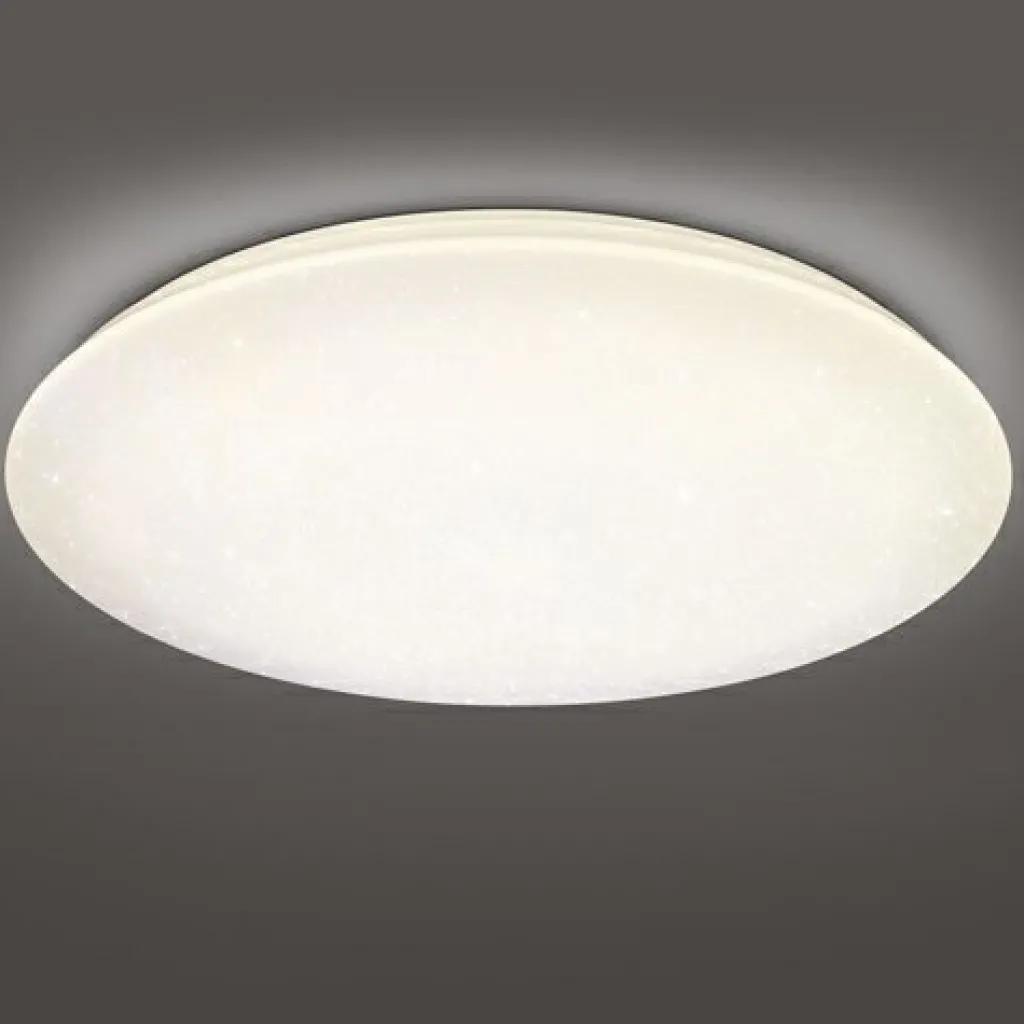 Moderne et fonctionnel : le plafonnier LED NAGANO s’intègre parfaitement dans les intérieurs modernes grâce à son design sobre. La lampe ronde avec une surface tendance effet ciel étoilé est ultra polyvalente puisqu’elle permet de créer la luminosité souhaitée selon l’ambiance de la pièce. L’intensité lumineuse du luminaire NAGANO est réglable à l’aide de la télécommande et la température de couleur peut varier en continu entre 3000 et 5500 Kelvin afin de créer l’ambiance lumineuse souhaitée. De plus, le plafonnier dispose d’une fonction veilleuse pouvant également être actionnée via la télécommande. Grâce à la fonction mémoire intégrée, le dernier réglage de la luminosité est enregistré dans la télécommande et réactivé dès que la lampe est éteinte et rallumée à l’aide de l’interrupteur mural. Les ampoules LED intégrées disposent d’une puissance lumineuse de 6400 Lumen pour une puissance de 80 Watts. La lampe NAGANO a un diamètre de 79 cm et une hauteur de 10,8 cm. La lampe dispose, en outre, de la technologie LED qui se caractérise par une luminosité de qualité et une excellente efficacité énergétique. Ceci permet d’économiser 80 % des coûts énergétiques par rapport aux ampoules halogènes habituelles. De plus, les sources lumineuses LED ont une durée de vie accrue, produisent moins de chaleur et participent à la protection de l’environnement.