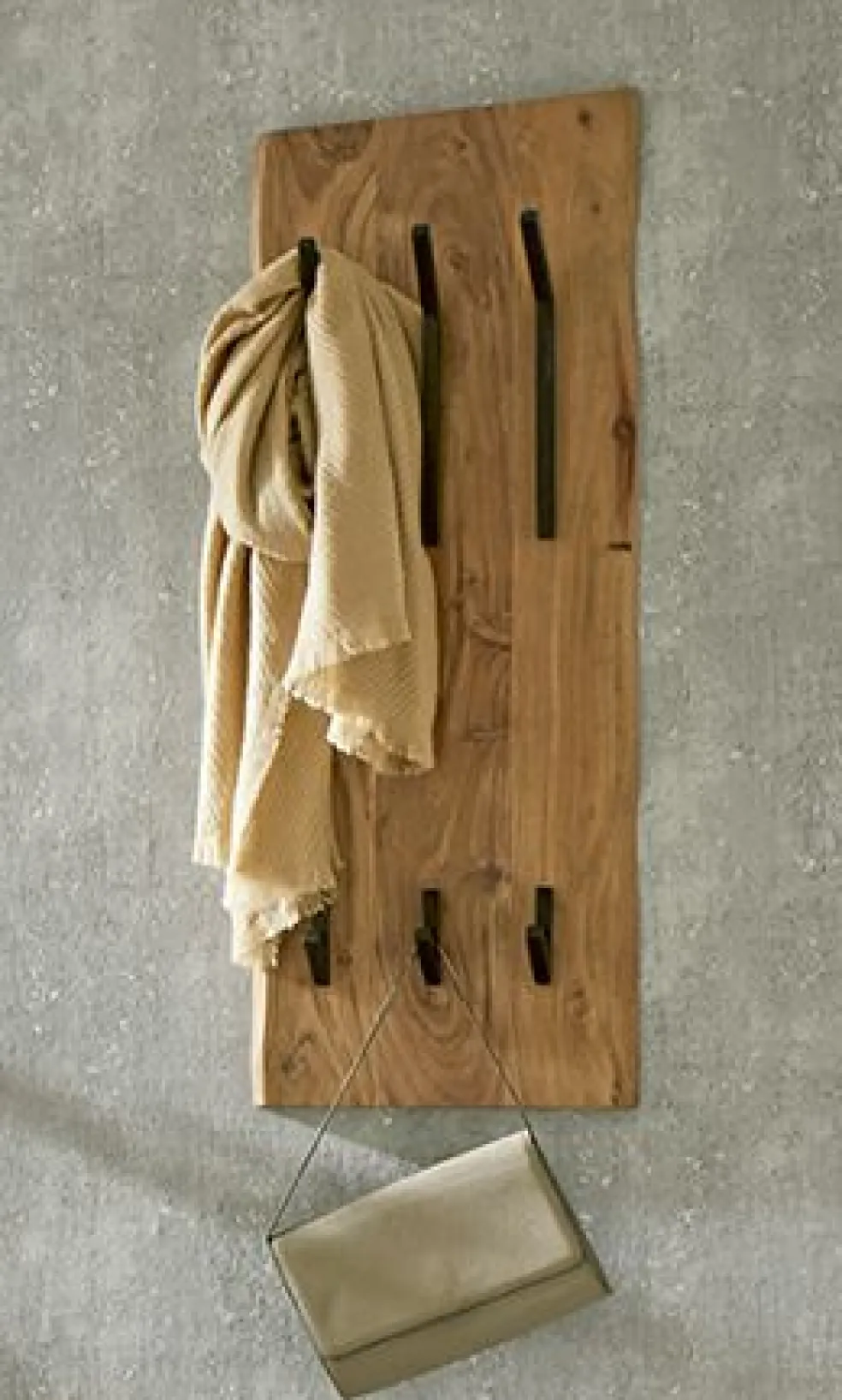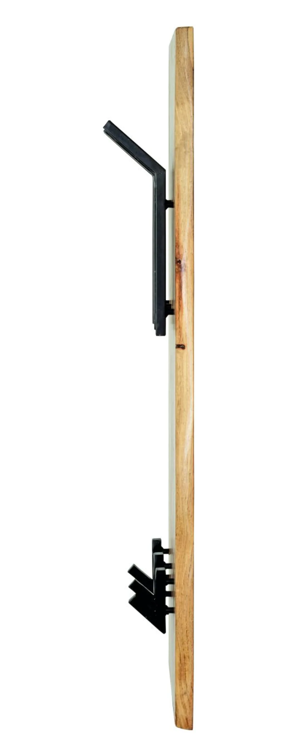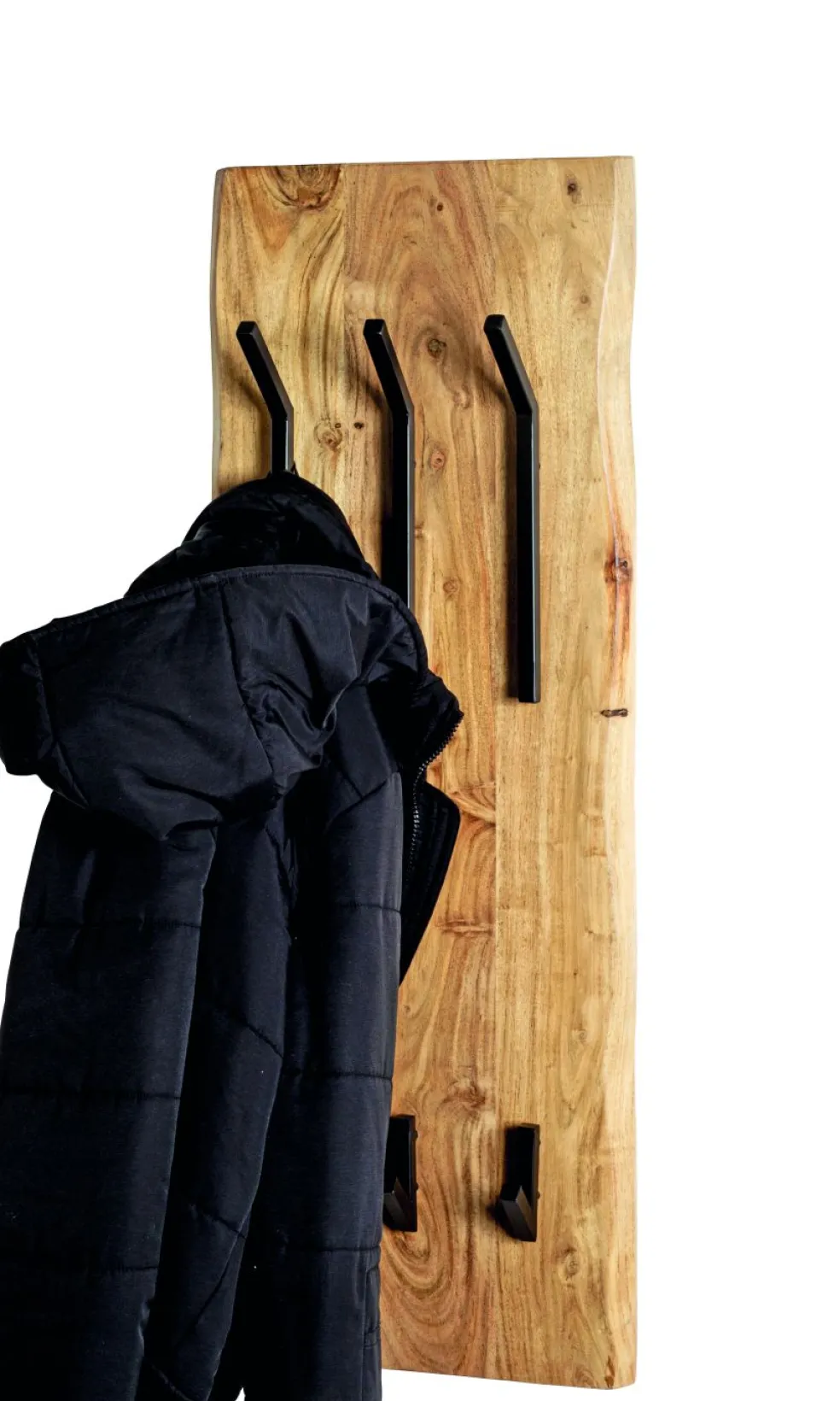 en bois d’acacia massif laissé à l’état naturel avec crochets en métal finition époxy ton noir