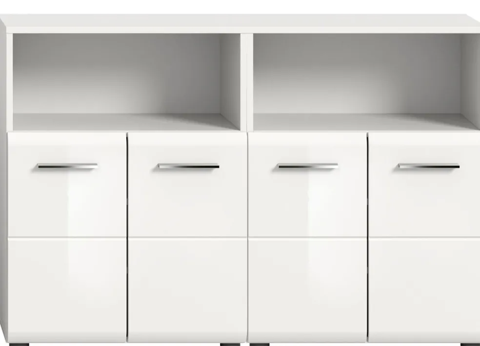 2 meubles de salle de bains avec 1 casier ouvert, 2 portes et 1 tablette amovible chacun