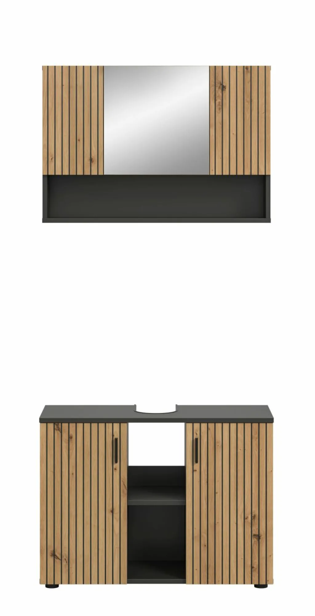 1 meuble sous lavabo avec 2 portes, 3 tablettes amovibles et 2 casiers ouverts