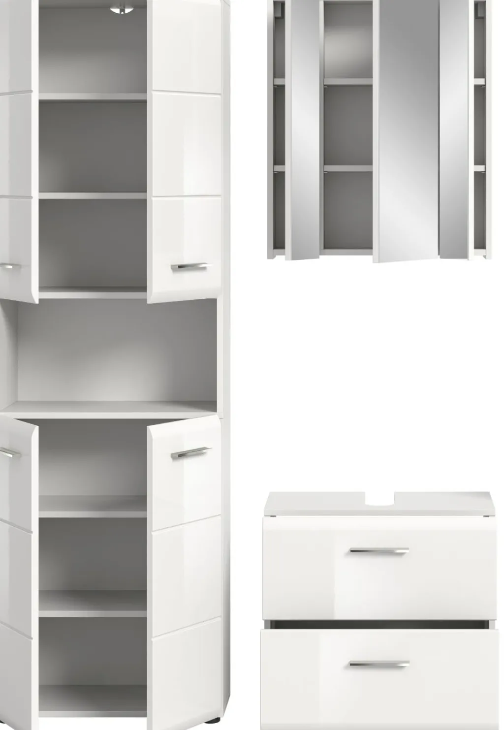 1 colonne de salle de bains avec 4 portes, 3 tablettes amovibles et 1 casier ouvert