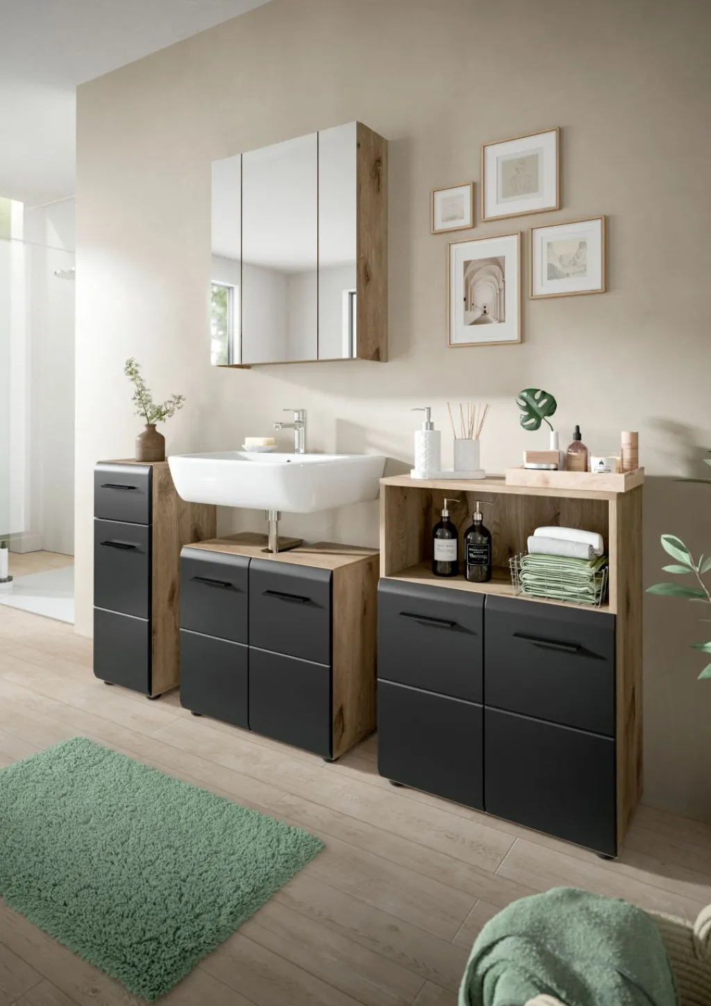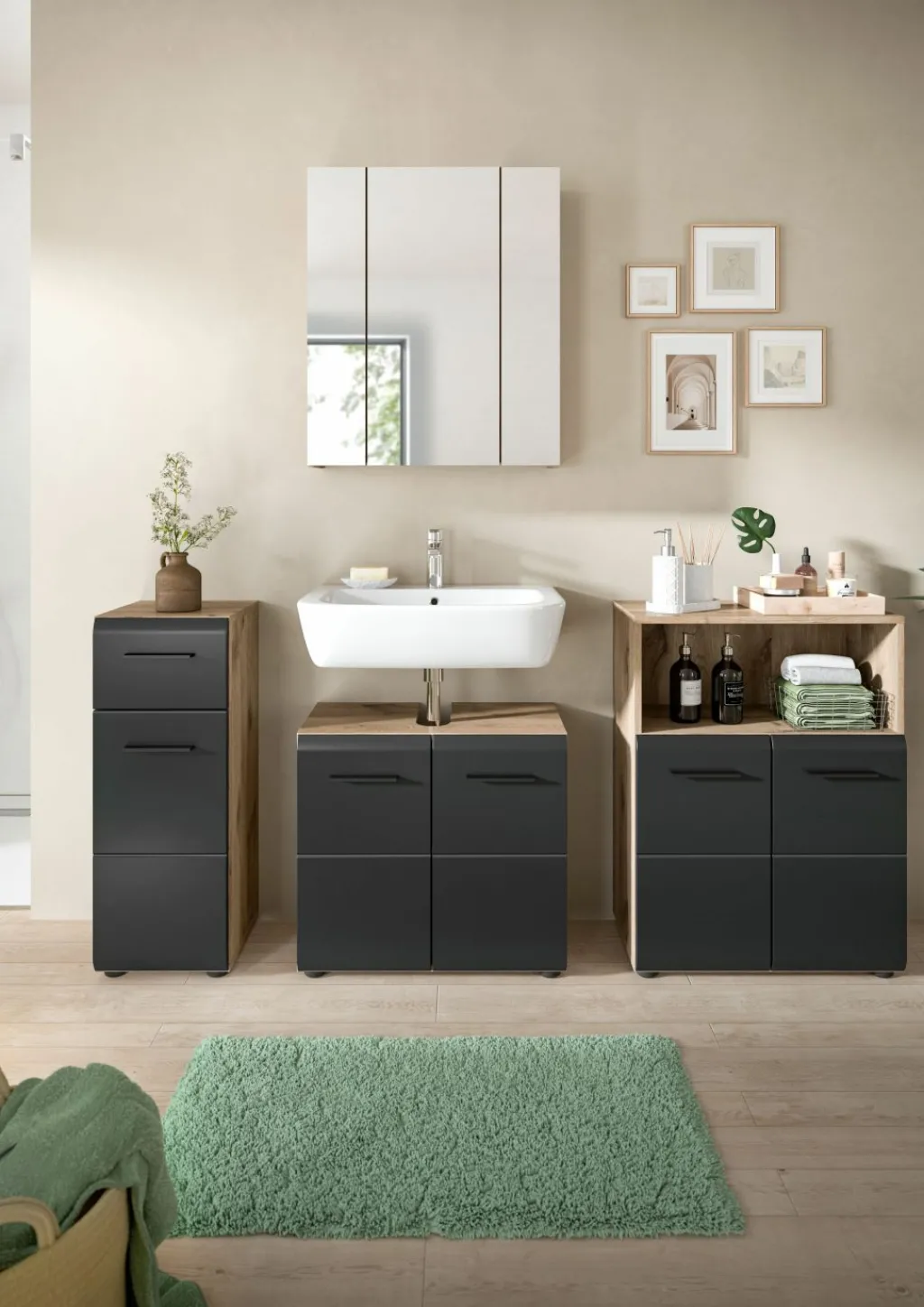 1 meuble de salle de bains avec 1 casier ouvert, 2 portes et 1 tablette amovible
