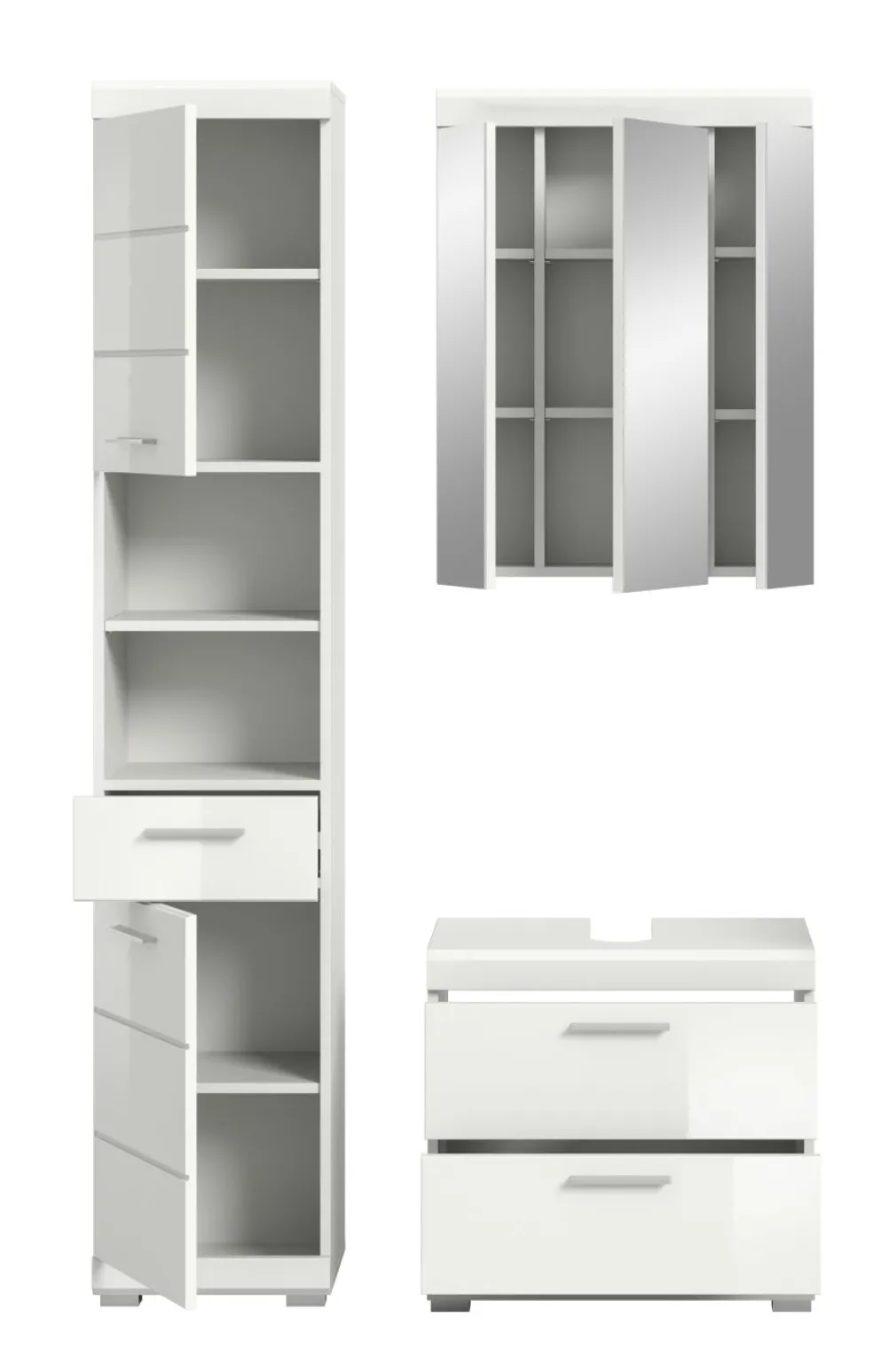 1 colonne de salle de bains avec 2 portes, 1 tiroir, 2 casiers ouverts, 2 tablettes fixes et 3 tablettes amovibles