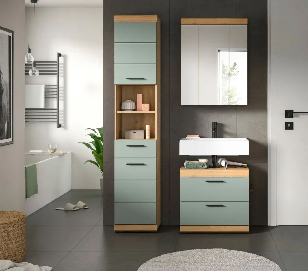 1 colonne de salle de bains avec 2 portes, 1 tiroir, 2 casiers ouverts, 2 tablettes fixes et 3 tablettes amovibles