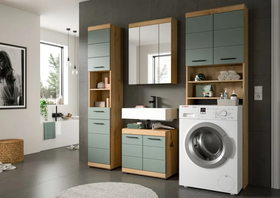 1 meuble pour machine à laver avec 2 portes, 3 tablettes amovibles, 2 casiers ouverts et 2 tablettes fixes