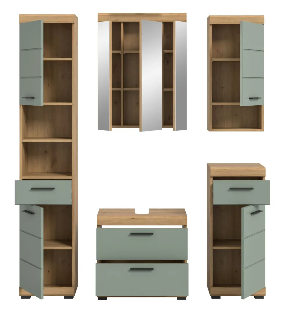 1 colonne de salle de bains avec 2 portes, 1 tiroir, 2 casiers ouverts, 2 tablettes fixes et 3 tablettes amovibles