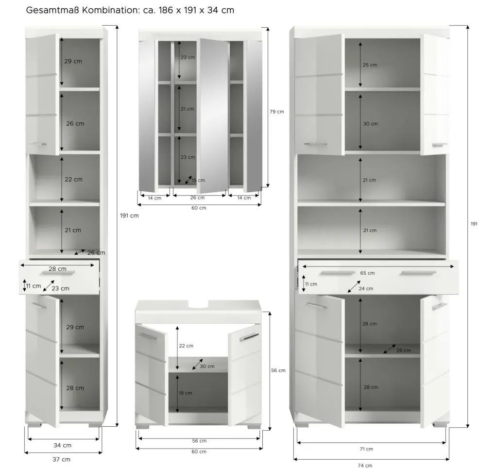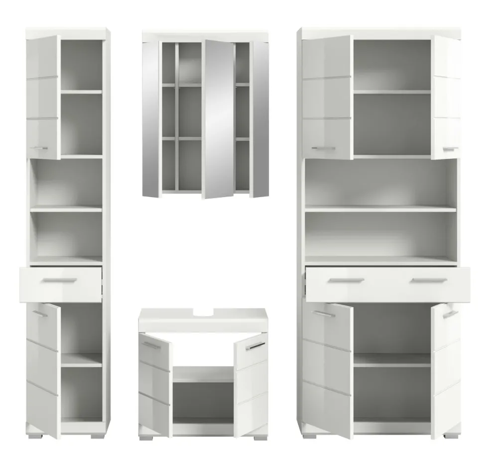 1 colonne de salle de bains avec 4 portes, 1 tiroir, 2 casiers ouverts, 2 tablettes fixes et 3 tablettes amovibles