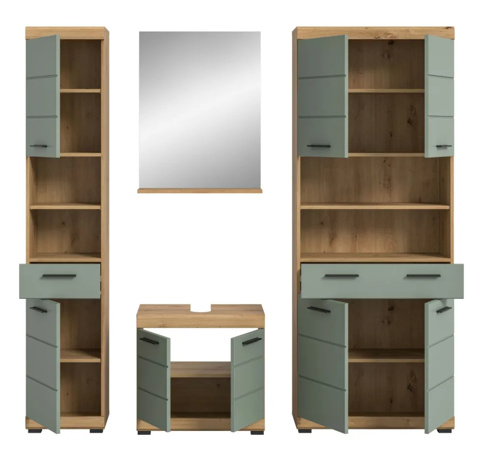 1 colonne de salle de bains avec 2 portes, 1 tiroir, 2 casiers ouverts, 2 tablettes fixes et 3 tablettes amovibles