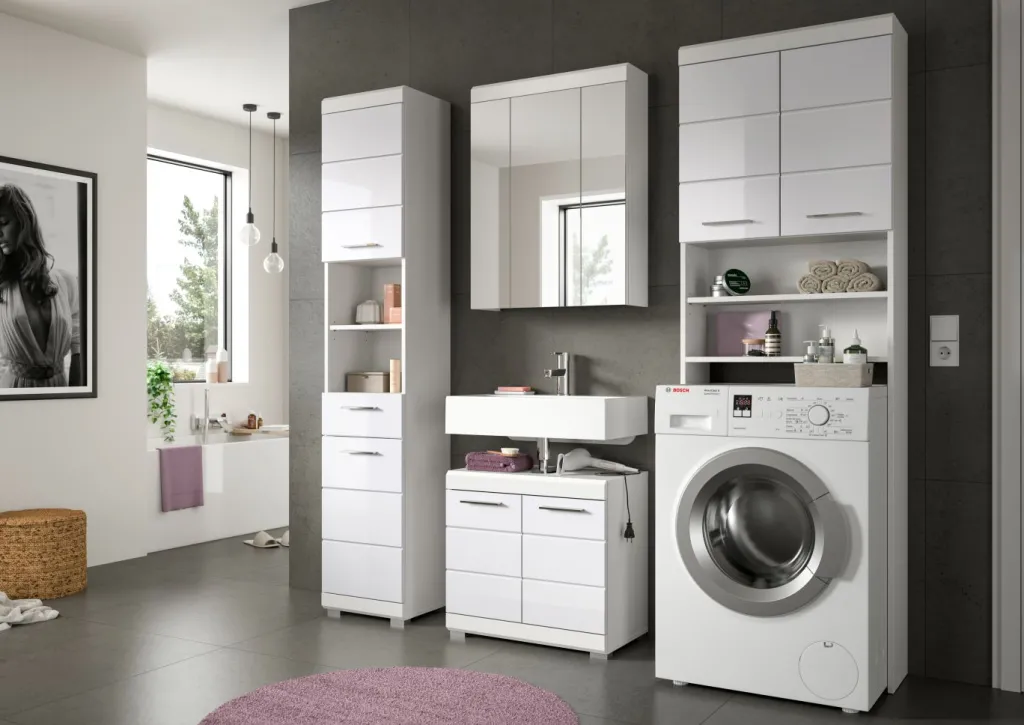 1 meuble pour machine à laver avec 2 portes, 3 tablettes amovibles, 2 casiers ouverts et 2 tablettes fixes