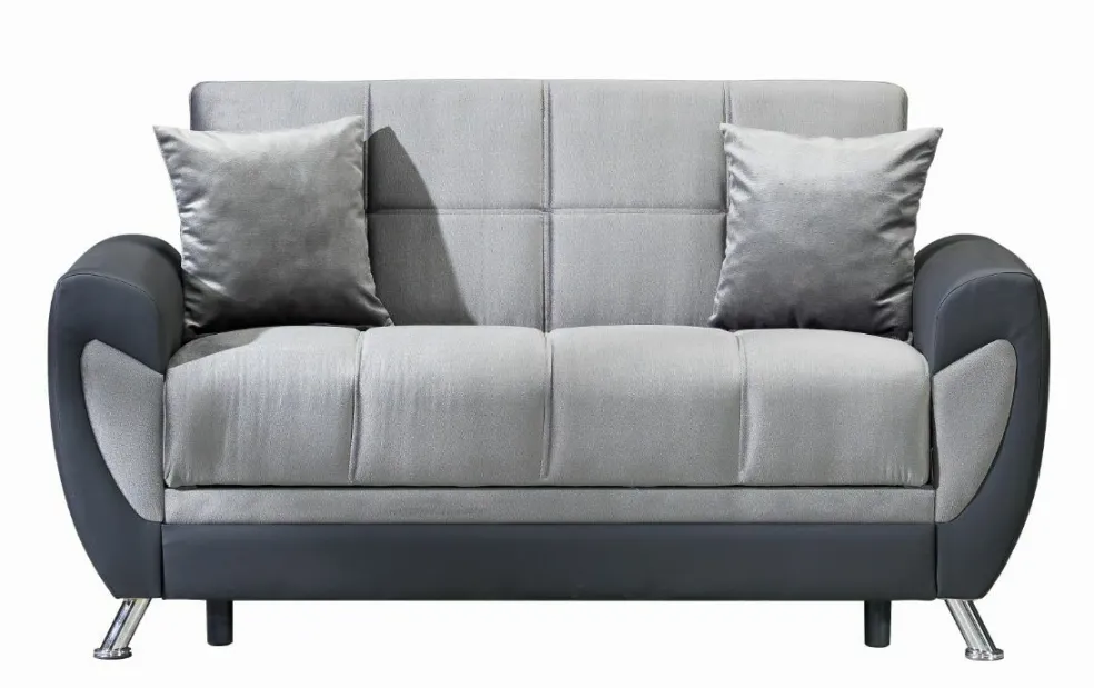 1 canapé 2 places avec coffre de lit et 2 coussins décoratifs