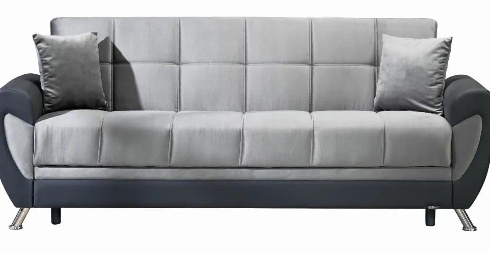 1 canapé 3 places avec coffre de lit et 2 coussins décoratifs
