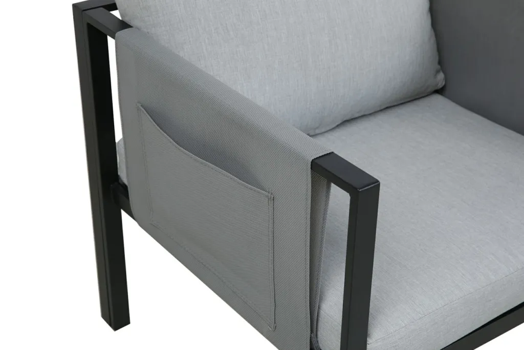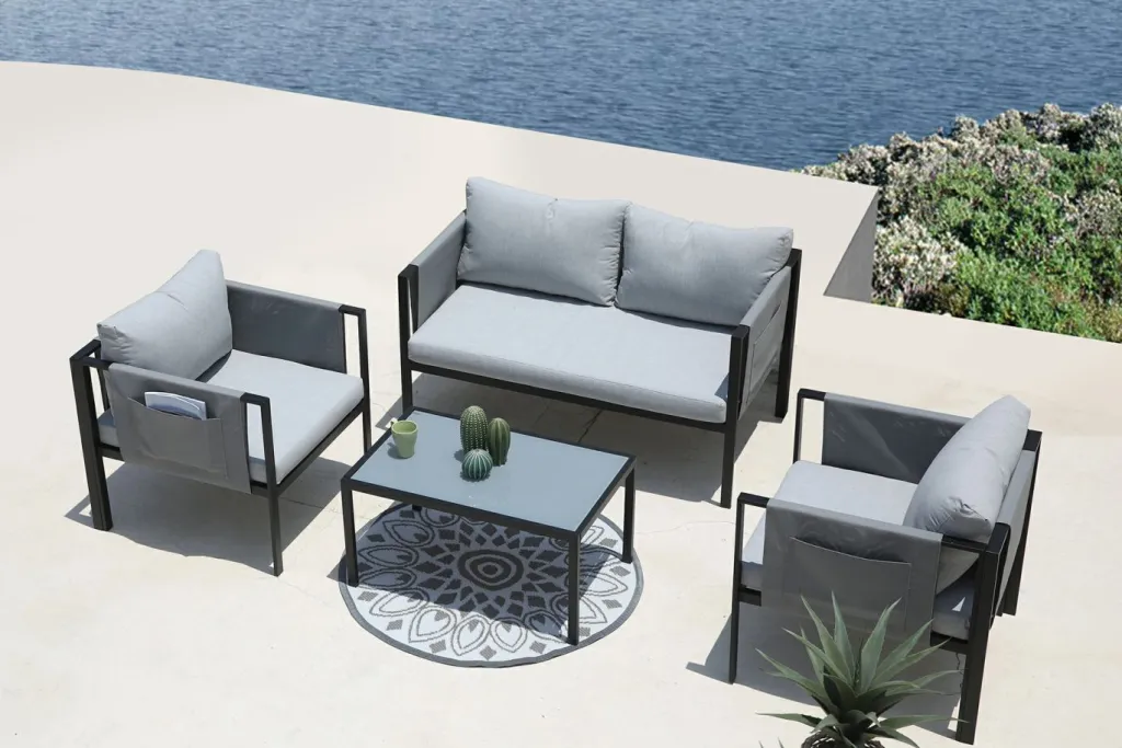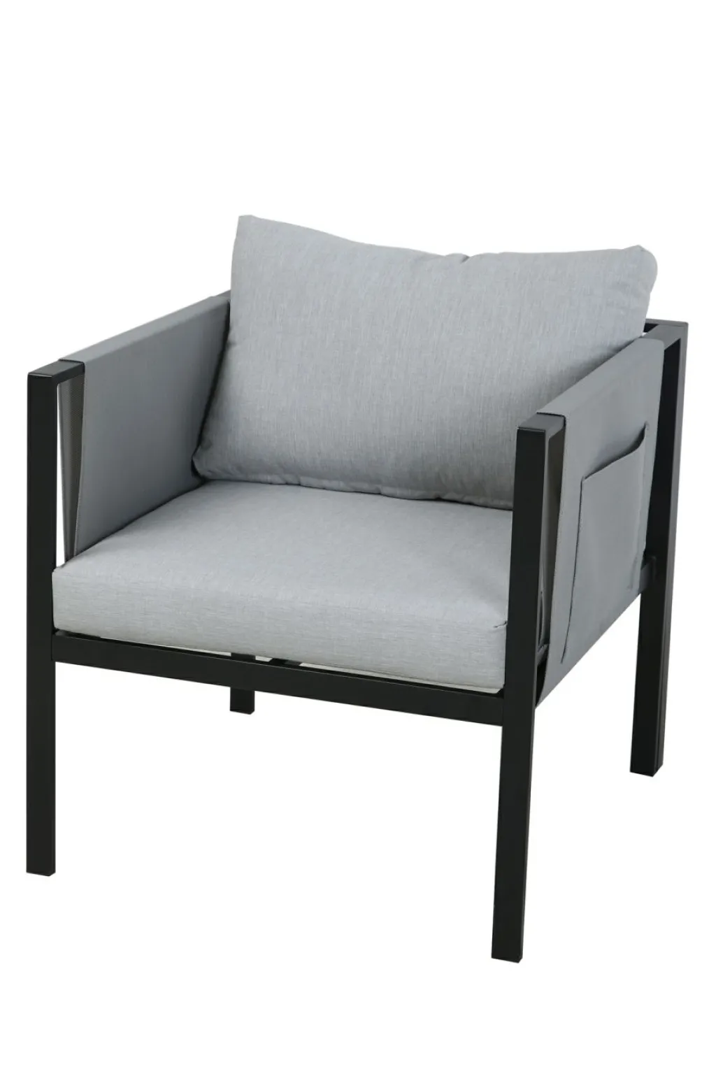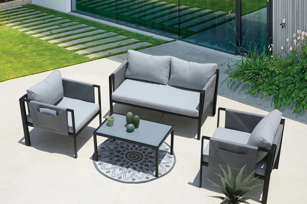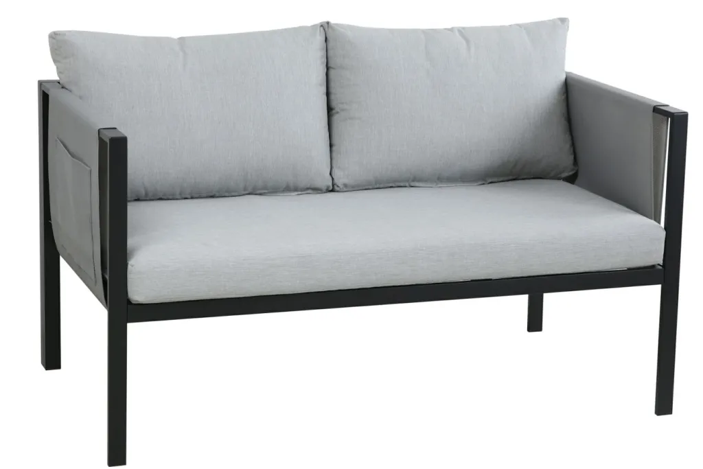 Revêtement des coussins d’assise : oléfine (polyéthylène ou polypropylène) ton gris