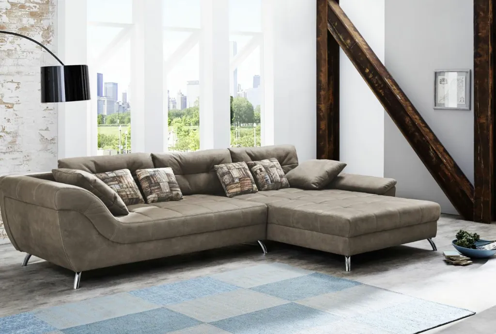 Canapé d’angle ultra tendance aspect nubuck avec une surpiqûre attrayante dans l’assise. Le garnissage de qualité avec suspension nosag, mousse polyéther et couche de mousse haute résilience intégrée garantit un excellent confort d’assise. Grâce à son dos habillé, ce canapé peut être positionné librement dans la pièce.