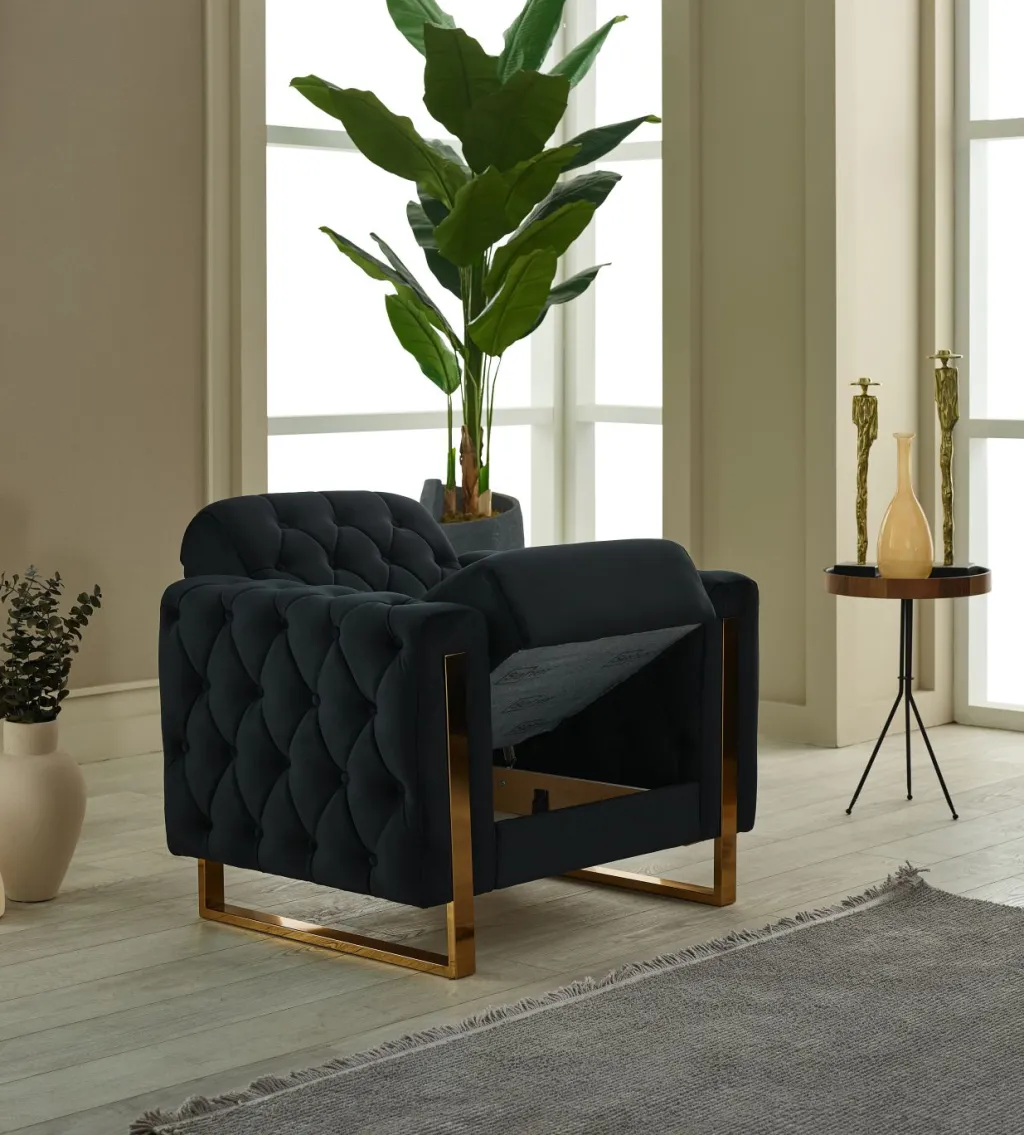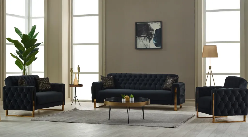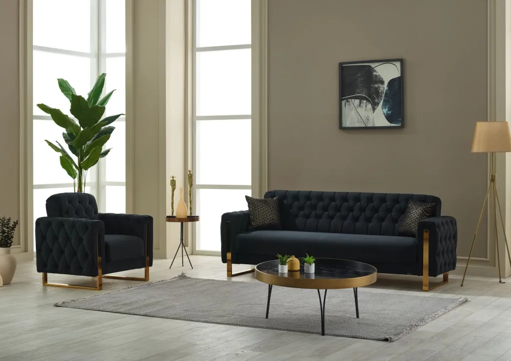 Revetement : tissu Melon Soft de couleur noire, compose de 70 % polyester et 30 % coton