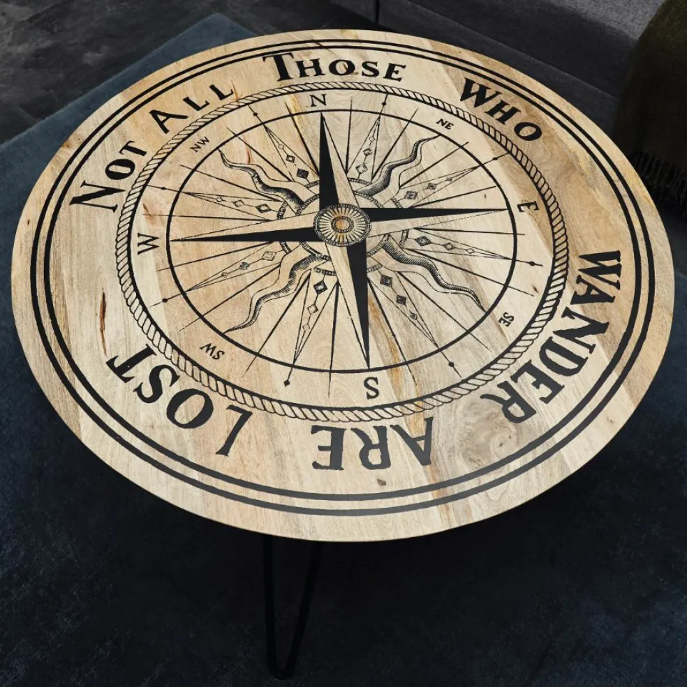 Plateau de table : bois de manguier massif (Inde) avec motif imprimé boussole