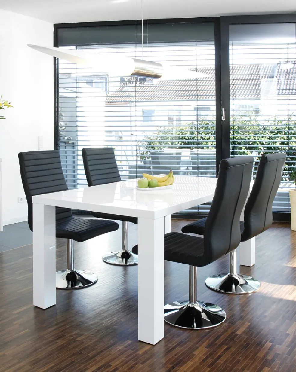 Plateau de table et piètement : MDF (panneau de fibres de bois de densité moyenne) laqué ton blanc ultra brillant