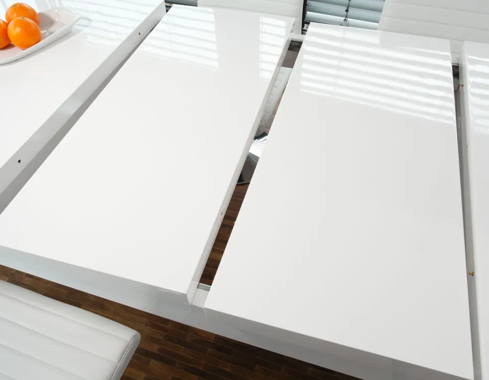 Plateau de table et piètement : MDF (panneau de fibres de bois de densité moyenne) laqué ton blanc ultra brillant