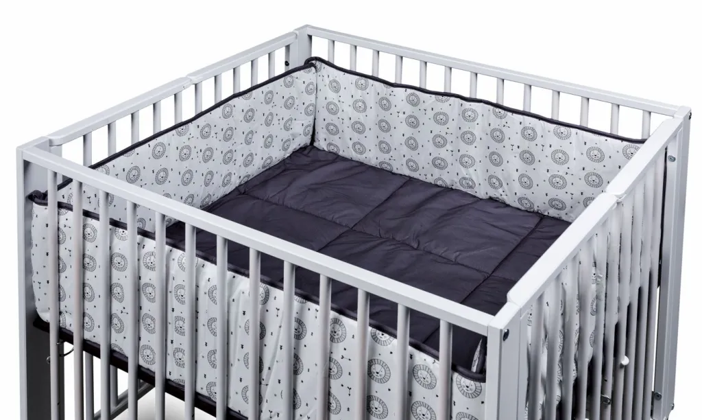 Le tapis moelleux en coton naturel avec garnissage en polyester s’attache aux barreaux du parc grâce aux nouettes.