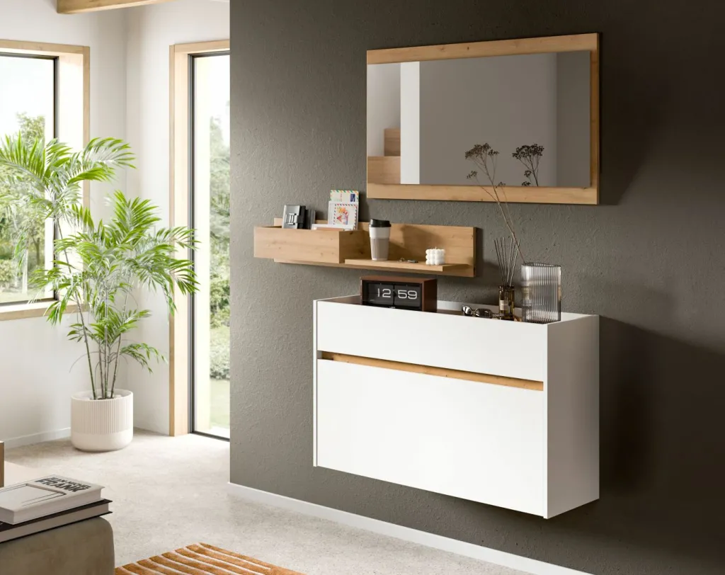 1 meuble à chaussures avec 1 tiroir, 1 abattant et 1 rangement pour chaussures, à suspendre